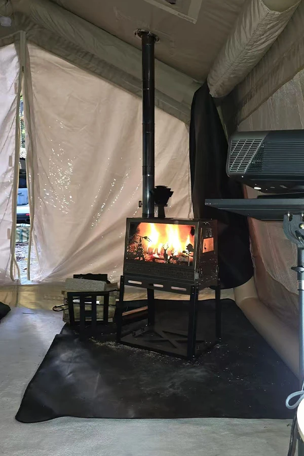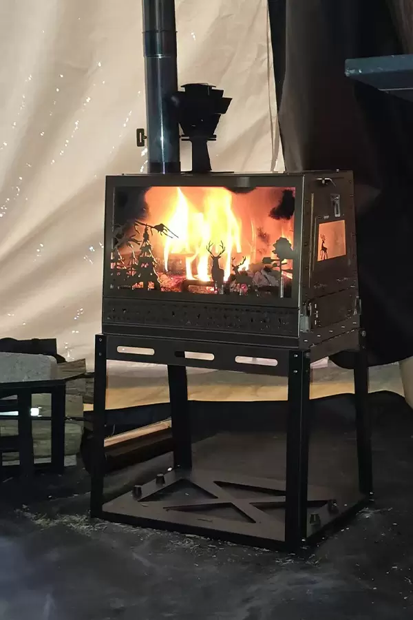 Эта печь, идеально представленная в данной сцене, обеспечивает мощный нагрев, сохраняя при этом элегантный внешний вид: панель с лазерной резкой в виде силуэтов диких животных создает завораживающую атмосферу леса, а пламя танцует за стеклом. Независимо от того, наслаждаетесь ли вы тихим вечером под звездами или делитесь историями с друзьями, эта портативная, но прочная дровяная печь обеспечит надежное тепло и атмосферное освещение.